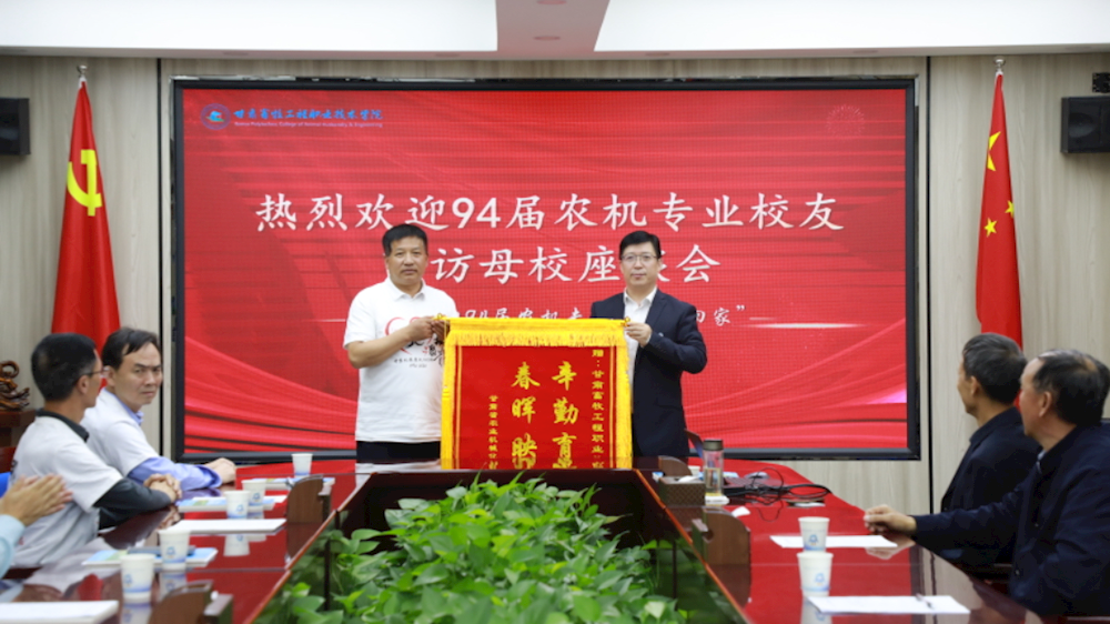在学院的精心安排下,校友们参加了一场别开生面的座谈会。会上,田宗祥对校友们的到来表示热烈的欢迎。随后,田宗祥简要回顾了学院的发展历史,并从职业教育发展前景、学院办学定位和下一步发展思路等方面向校友们做了详细介绍。对一直以来关注与支持学院发展的94届农机专业的校友表示感谢,也希望校友们常回家看看,积极参与到母校的发展与建设中来,为母校发展提出宝贵的建议。校友们也相继交流表达了自己对母校发展的感慨与感恩之情,为表达对母校的感恩之情,94届农机专业校友为母校送上锦旗。